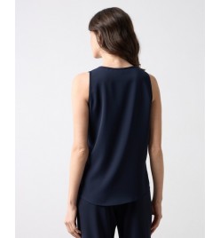 Sleeveless blouse with round neckline .